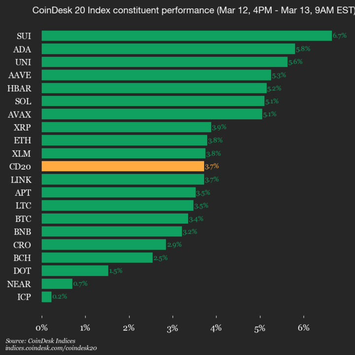 Der CoinDesk 20 notiert derzeit bei 2077,68, ein Anstieg von 3,7 % (+74,61) seit 16 Uhr ET am Donnerstag.
