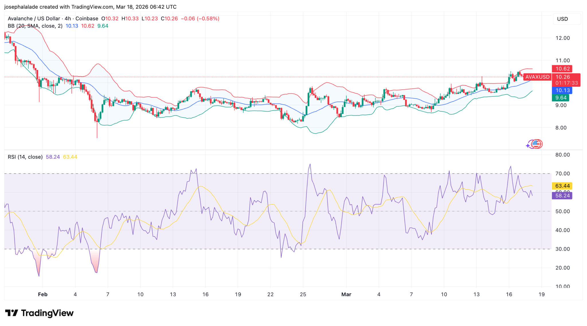 $AVAX-Kurschart | TradingViewDie Bollinger-Bänder zeigen, dass sich der Kurs in Richtung des oberen Bandes bei 10,62 $ bewegt, wobei das mittlere Band bei 10,13 $ und das untere bei 9,64 $ liegt. Die Bänder sind relativ eng, eine Konstellation, die sich historisch gesehen eher mit einem Richtungsschub als mit einer anhaltenden Seitwärtsbewegung auflöst. Der RSI auf dem 4-Stunden-Chart liegt bei 58,24, wobei die Signallinie bei 63,44 steht, was darauf hindeutet, dass sich das Momentum gegenüber den jüngsten Höchstständen abgeschwächt hat, sich aber noch nicht umgekehrt hat.