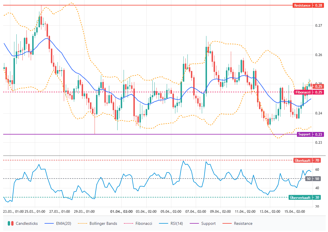 Charttechnisch notiert $ADA knapp oberhalb des EMA-20, der aktuell bei rund 0,245 US-Dollar verläuft. Seit dem 14. April lassen sich zudem leicht höhere Tiefs erkennen – ein Zeichen dafür, dass sich der Kurs kurzfristig stabilisiert hat. Solange $ADA oberhalb dieses gleitenden Durchschnitts bleibt, ist das technische Bild neutral mit leichter Aufwärtstendenz.