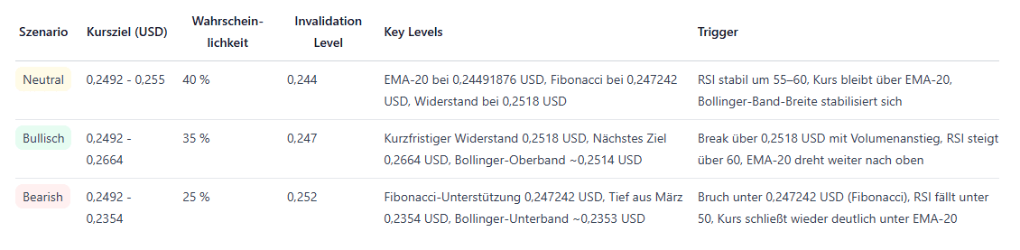 Auf der Oberseite bleibt 0,2518 US-Dollar die unmittelbare Hürde. Darüber rückt der größere Swing-Bereich bei 0,2664 US-Dollar in den Fokus. Ein nachhaltiger Anstieg über 0,2518 US-Dollar würde das kurzfristige Bild aufhellen und Raum für eine Bewegung in Richtung 0,2664 US-Dollar eröffnen.