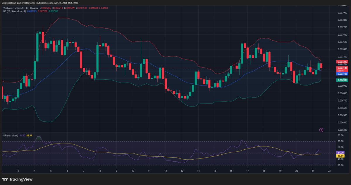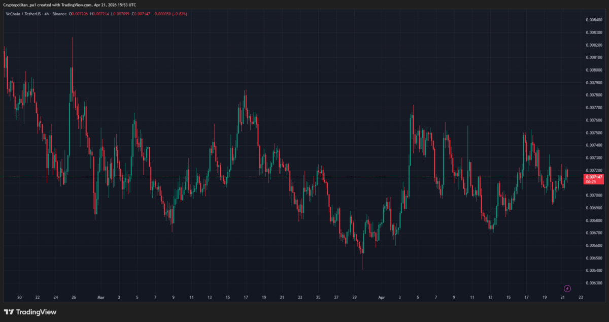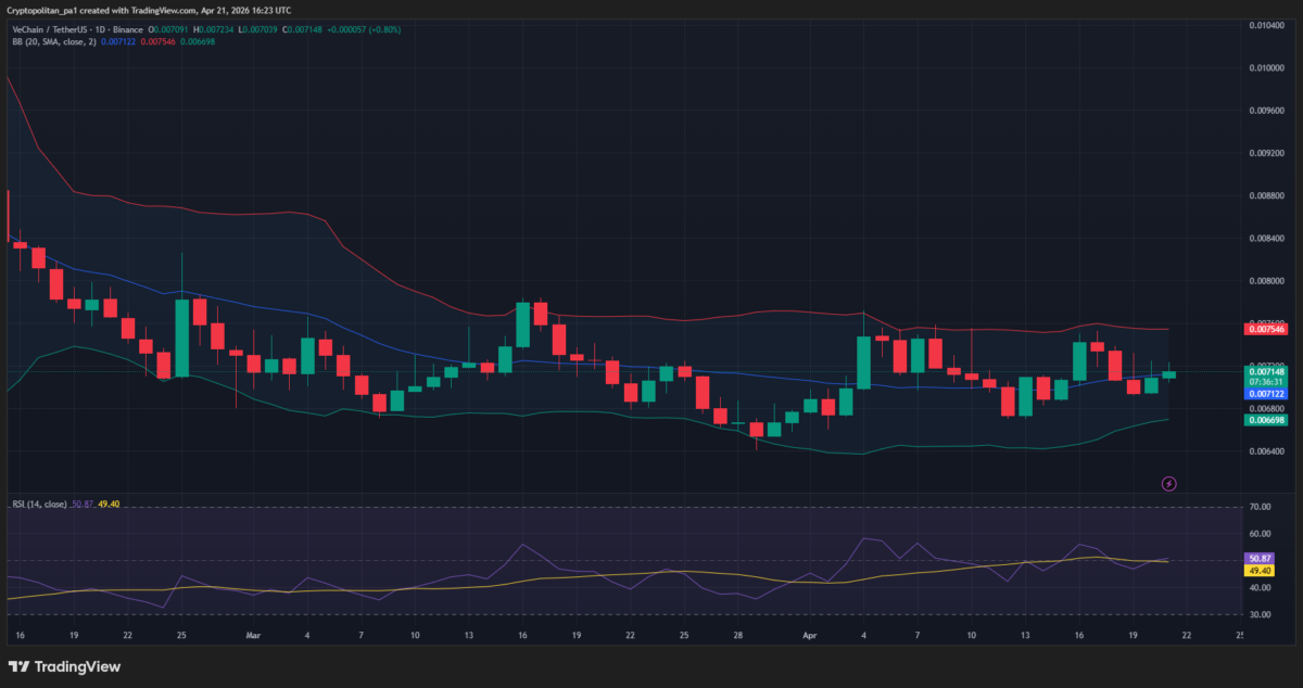 Die aktuelle Kursanalyse VeChain ($VET) vom 21. April zeigt eine deutliche Erholung in den letzten zwei Tagen. $VET stieg von 0,006950 $ auf 0,007200 $. Seitdem fiel der Kurs wieder auf das aktuelle Niveau von 0,007148 $trac, da der Abwärtsdruck oberhalb der Marke von 0,007200 $ weiterhin hoch ist.