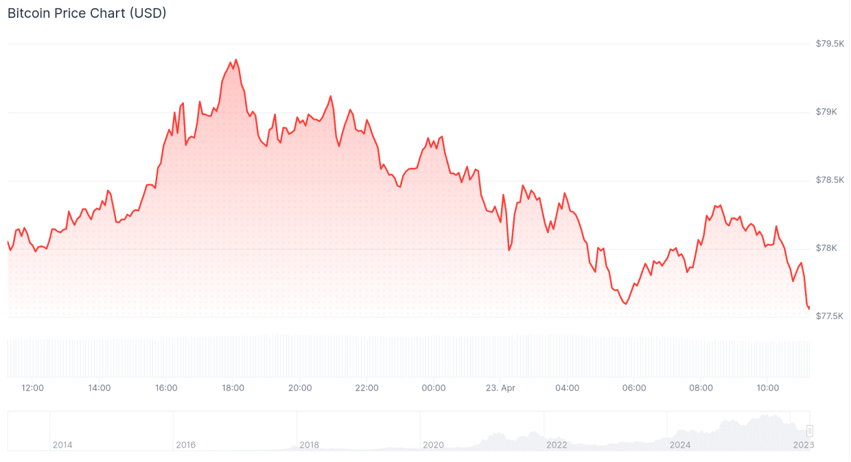 Seitdem hat sich Bitcoin wieder nach unten bewegt. Nach einem langsamen Rückgang wurde heute Morgen gegen 11:15 Uhr der Tiefpunkt bei rund 77.600 Dollar erreicht. Das bedeutet, dass der Kurs insgesamt um fast 2,4 Prozent gefallen ist.