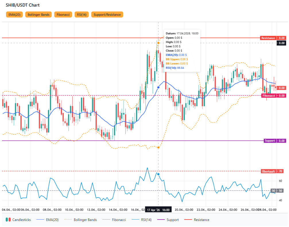 Die Kursentwicklung von $SHIB/USDT über mehrere Tage im April verläuft insgesamt seitwärts und ist von kleineren Auf- und Abwärtsbewegungen geprägt. Der gleitende Durchschnitt (EMA 20) verläuft relativ flach, was darauf hindeutet, dass aktuell kein klarer Trend vorliegt. Auch die Bollinger Bänder zeigen, dass sich der Kurs innerhalb einer normalen Schwankungsbreite bewegt, ohne starke Ausbrüche nach oben oder unten.