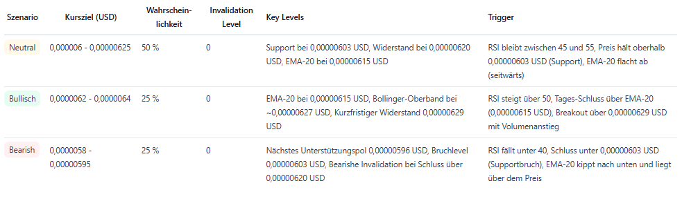 Es lassen sich drei mögliche Szenarien für die weitere Kursentwicklung unterscheiden. Im neutralen Fall bewegt sich der Kurs weiterhin seitwärts in einer Spanne zwischen etwa 0,0000060 und 0,00000625 USD, mit einer Wahrscheinlichkeit von rund 50 %. Dabei bleibt der RSI im Bereich zwischen 45 und 55 und der Kurs hält sich über dem Unterstützungsniveau, während der EMA-20 weitgehend flach verläuft. Im bullischen Szenario, das mit etwa 25 % eingeschätzt wird, könnte der Kurs in Richtung 0,0000064 USD steigen, sofern der RSI über 50 anzieht und der Kurs über den EMA-20 sowie wichtige Widerstände ausbricht.