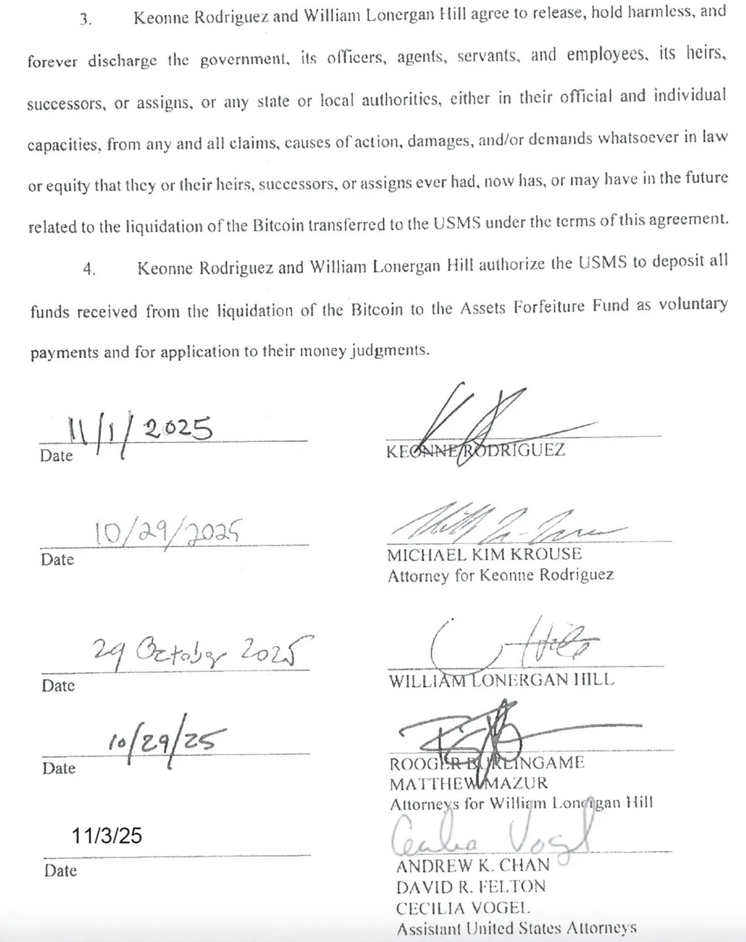 Keonne Rodriguez und William Lonergan Hill ermächtigen den USMS, das Bitcoin-Konto zu übernehmen und es unverzüglich in einer vom USMS festgelegten Weise zu liquidieren, wozu auch die Nutzung einer Kryptowährungsbörse gehört. Keonne Rodriguez und William Lonergan Hill sind sich bewusst, dass die vom USMS genutzte Börse bei der Liquidation der Bitcoins eine Gebühr erhebt, die direkt aus dem Erlös der Liquidation bezahlt wird. Keonne Rodriguez und William Lonergan Hill erklären sich bereit, diese Gebühr zu zahlen.