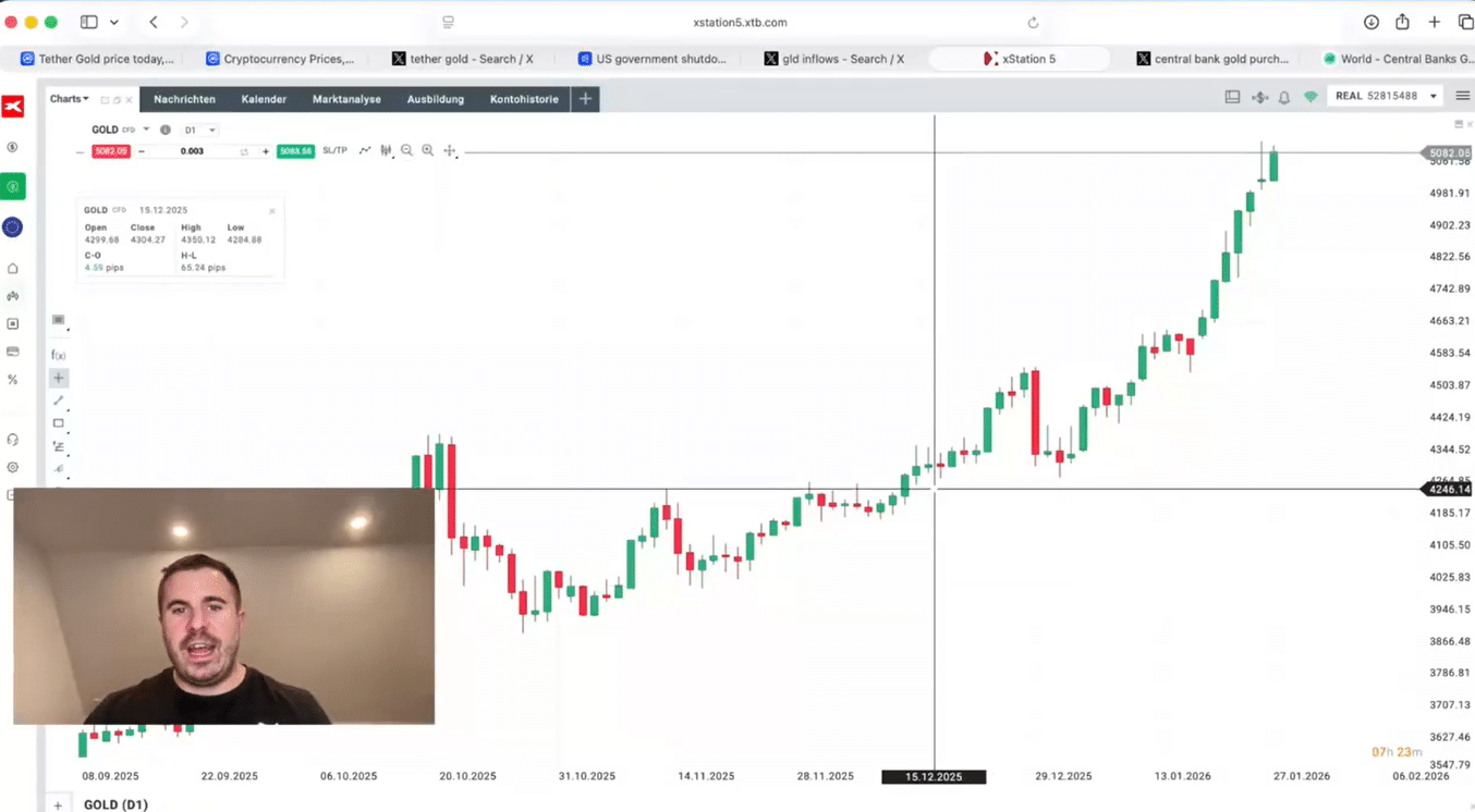 Gold setzt seine starke Bewegung der letzten Monate fort. Fast täglich entstehen neue Allzeithochs, zuletzt wurde auch die Marke von 5.000 US-Dollar überschritten. Währenddessen läuft Bitcoin seit geraumer Zeit seitwärts. Kapitalströme verschieben sich, der Blick vieler Marktteilnehmer wandert wieder stärker in Richtung Edelmetalle. Die große Frage dreht sich weniger um das „Ob“, sondern um das „Wie weit“,so dder Experte Manuel vom Kanal "rundumbitcoin".