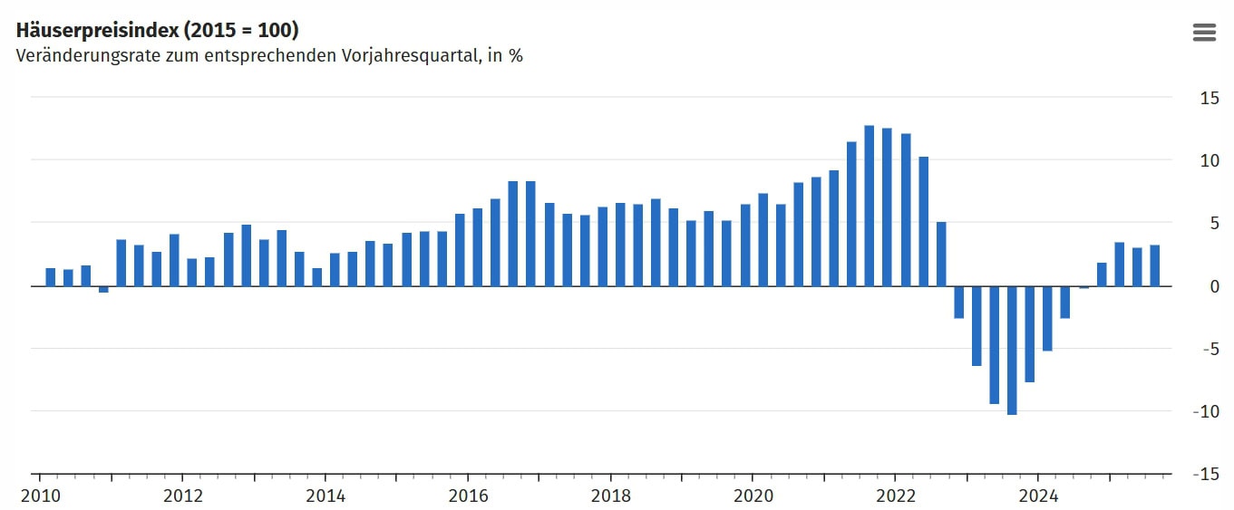 Auch die Immobilienpreise gerieten mit der Zinswende im Jahr 2022 zunächst spürbar ins Wanken, nachdem sie über Jahre vom billigen Geld profitiert hatten. In den vergangenen Jahren kam es real zu Rückgängen, zuletzt setzte jedoch wieder eine leichte Erholung ein. Die Schwankungen bleiben dabei deutlich geringer als bei Bitcoin, was die Anlage für viele Investoren planbarer erscheinen lässt.