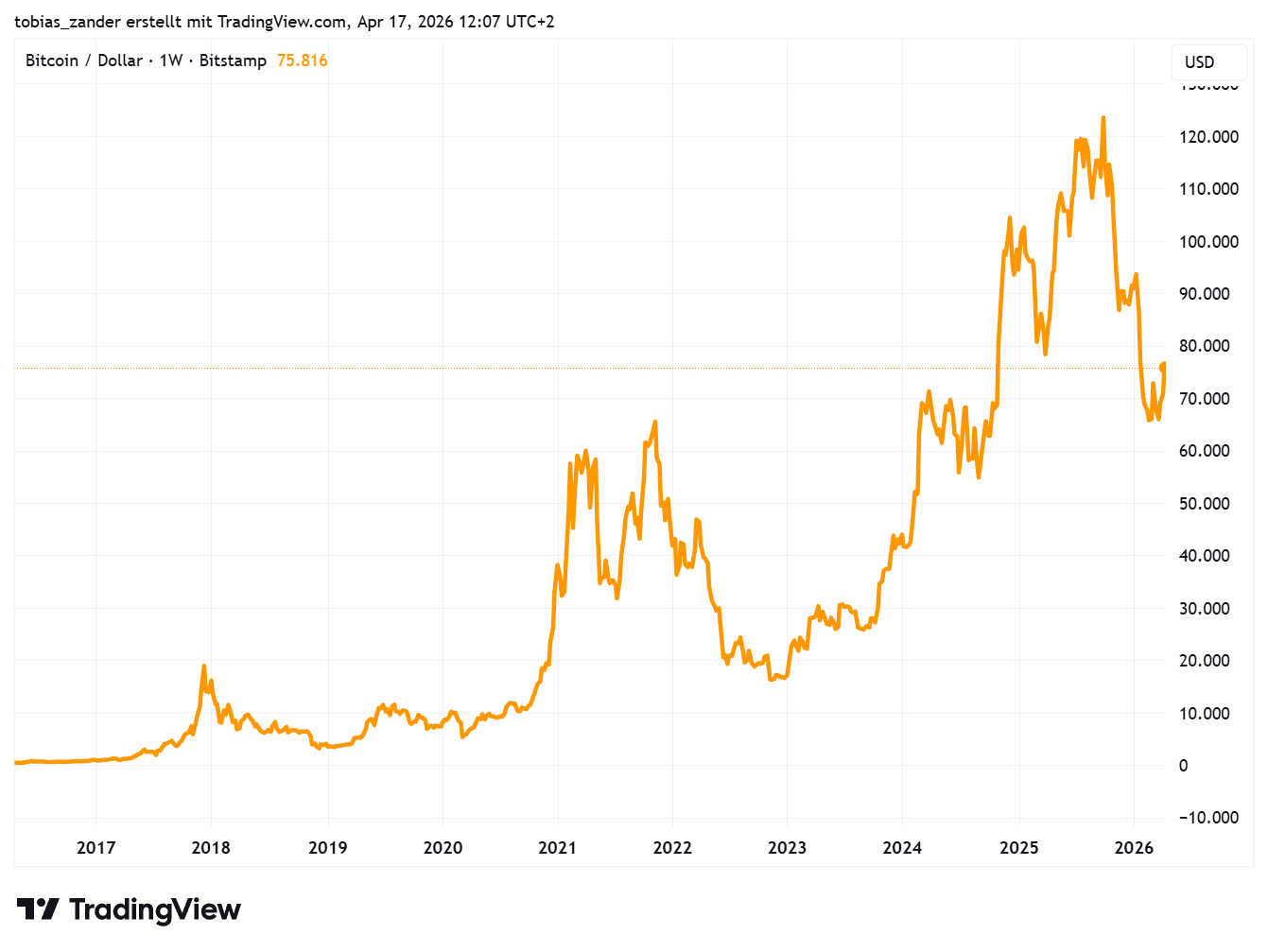 Gegenüber dem Allzeithoch im Oktober hat Bitcoin rund 40 Prozent an Wert verloren und pendelt aktuell im Bereich zwischen 70.000 und 75.000 US-Dollar. Auf Jahressicht ergibt sich daraus ein Minus von rund zehn Prozent. Und auch auf Fünfjahressicht wirkt die Entwicklung inzwischen deutlich weniger spektakulär als noch am Hoch des letzten Bullenmarktes. Wer allerdings noch weiter zurückblickt, erkennt eine ganz andere Entwicklung: Anfang 2020 notierte der $BTC-Kurs noch im Bereich von 7.000 bis 8.000 US-Dollar. Trotz der jüngsten Korrektur steht damit weiterhin eine Vervielfachung zu Buche.