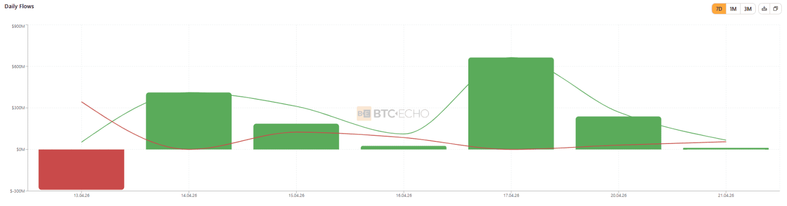 Auf breiter Marktebene zeigt sich ebenfalls Rückenwind. Laut Daten von $BTC-ECHO flossen in der vergangenen Woche über eine Milliarde US-Dollar in die Bitcoin ETFs.