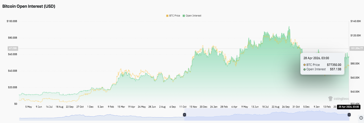 Open-Interest-Trends zeigen eine Veränderung im Marktverhalten. Sie stieg während der Rallye stetig an und erreichte mit einer Steigerung von Leveraged Positionen einen Höchststand von über 80 Milliarden Dollar. Allerdings deuten jüngste Rückgänge auf 57 Milliarden Dollar darauf hin, dass Händler das Risiko verringern. Dieses Herunterziehen deutet kurzfristig auf eine geringere Risikobereitschaft hin.