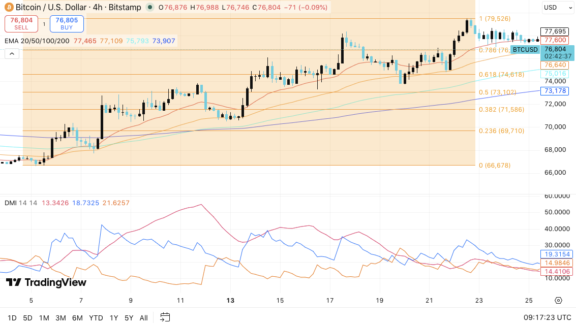 Bitcoin stabilisierte sich innerhalb eines engen Bandes im Vier-Stunden-Chart, was auf eine Abkühlungsphase nach seinem jüngsten Anstieg hindeutet. Das Asset erreichte 79.500 US-Dollar, bevor es ins Stocken kam, und handelt nun in einem komprimierten Bereich zwischen 76.600 und 78.000 US-Dollar.