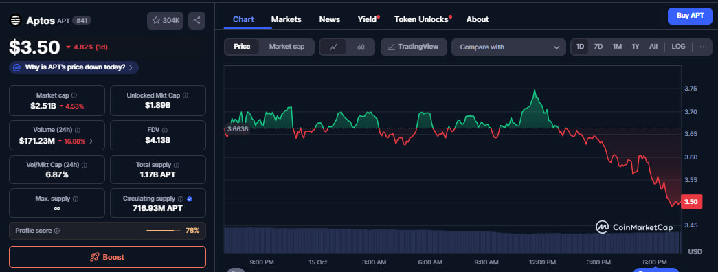 APT hat in den letzten 24 Stunden fast 5% seines Wertes verloren und wird bei 3,50 $ gehandelt.