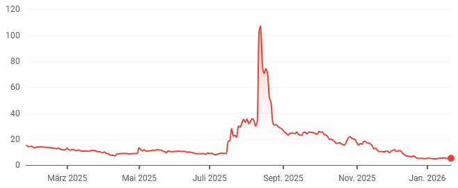 - Die Neuausrichtung findet vor dem Hintergrund eines massiven Kurssturzes statt: Die Aktie von ETHZilla war im August 2025 auf ein Hoch von über 100 US-Dollar geklettert, ist seitdem jedoch um 95 Prozent eingebrochen und schloss am Freitag bei nur noch 5,24 US-Dollar.