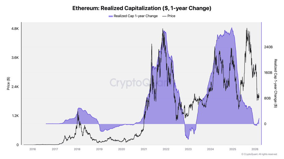 Zudem verweist CryptoQuant auf eine spürbar schwächelnde Investmentnachfrage seitens der Anleger. Die einjährige Veränderung der realisierten Kapitalisierung von Ethereum ist kürzlich in den negativen Bereich abgerutscht. Diese essenzielle Metrik verfolgt das Nettokapital, das in den Vermögenswert fließt oder diesen verlässt.