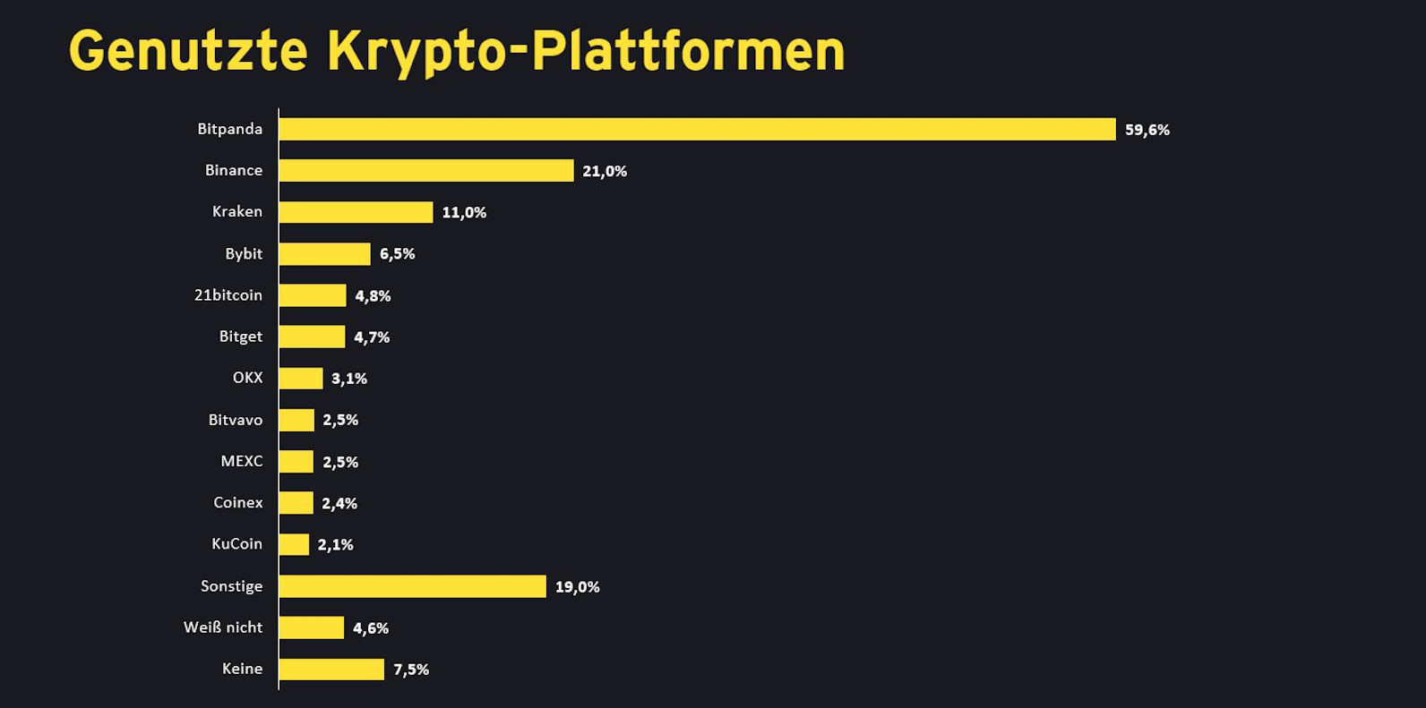 Weites vertreten in der Umfrage sind andere Player wie Bybit, 21bitcoin, Bitget, OKX oder KuCoin. Was nicht abgefragt wurde, sind breitere Investing-Apps wie etwa Trade Republic, Scalable Capital oder Revolut, wi User ebenfalls in Krypto-Assets investieren können: