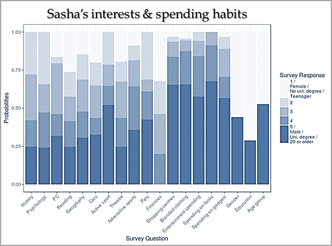 Latent Class 1 “Sasha”. We begin with members of the “Sasha” class of consumer, who are, on the whole, young, active, and have many interests. They are split between men and women almost evenly. About half the class’ members are below the age of 25, and half above. Today, a bit less than three-fifths of them hold a college degree. Sasha’s #1 and #2 interests are competitive sports and adrenaline sports, respectively. Pets are this class’s #3 interest. However, it is important to note here that, in contrast to the other classes, Sasha displays an unusually high investment across all 10 hobby and interest areas. It is therefore to be expected that this class does not save much money. Sasha generally spends the most on items related to looks and appearance and on name-brand clothes, followed by entertainment and gadgets. Members of this class enjoy visiting shopping malls.