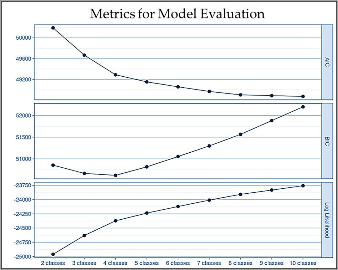 Based on these measures, we adopted a 4-class model, which has the best BIC value and beyond which increasing the number of classes does less and less to improve the model.