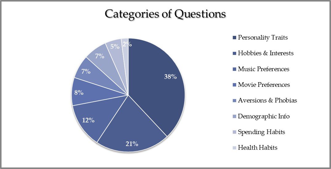 To explore attitudinal and behavioral distinctions among groups of Eastern European millennials, a purpose-appropriate dataset was obtained from the predictive modeling and analytics platform Kaggle. The dataset was generated using a 150-item survey distributed to 1,010 individuals, ranging in age from 20 to 35 (as of 2019), by Eastern European students in a university statistics class. The questions dealt with personality, interests, aversions, demographics, and habits, including spending habits, broken down in the categories shown below.