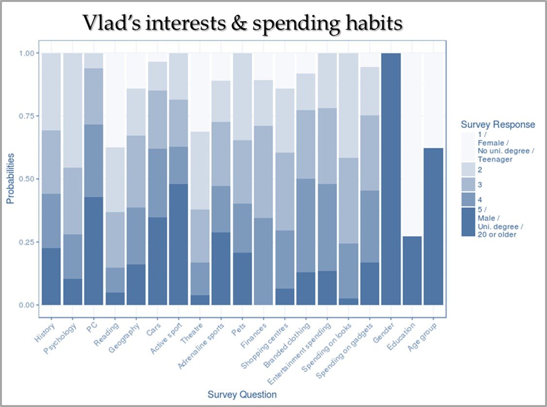 Latent Class 3 “Vlad”. Members of the “Vlad” class of millennial are composed exclusively of men, two thirds of whom are between 25 and 35 years old. Just over half of its members hold a college degree. Computers are Vlad’s #1 interest, and almost three-quarters of the group are interested in computing to some degree. Competitive sports and cars are in a close tie for his second-rated interest, followed by adrenaline sports. Perhaps it is not entirely surprising that Vlad displays almost no interest in reading poetry or going to the theater, and very little in studying psychology. Overall, Vlad - like Katya - holds a neutral view of saving. Both groups are willing to spend only in pursuit of their particular interests. In Vlad’s case, this means being willing to invest in name-brand clothes, entertainment, and gadgets, but spends very little on his appearance. He prefers not to visit shopping malls.