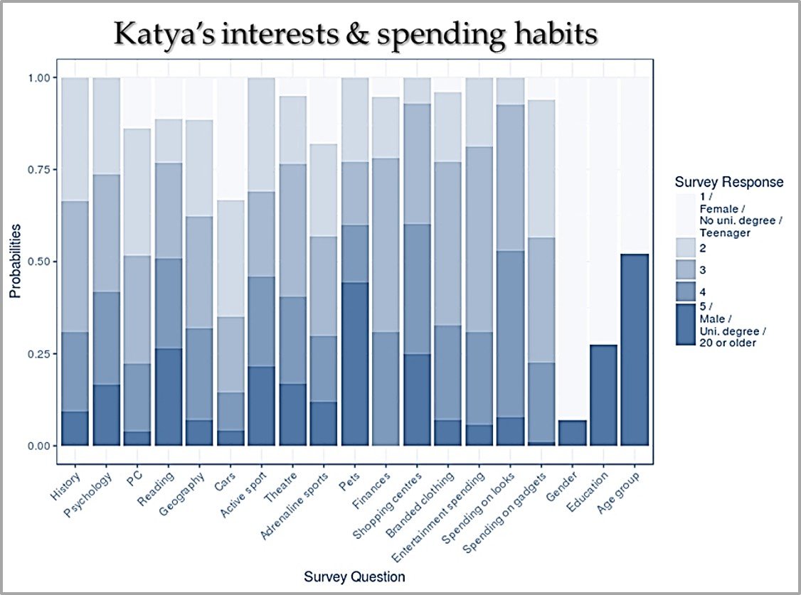 - “Katya” is female and spends selectively. She’s interested in beauty products and name-brand clothes but won’t spring for computers or gadgets.