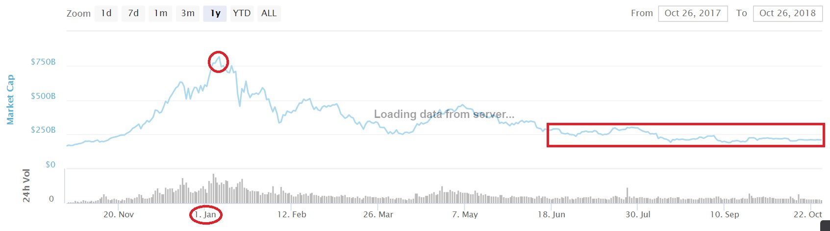 The current market situation seems to have consolidated and reached a common consensus about acceptable crypto prices. This can be seen both from the historically reduced volatility (while keeping similar trading volumes) and the price stability for a longer period of time. If we look at the below graph, we can see that the overall market cap of all cryptocurrencies has been hovering around the $230 B, while in January 2018 it has hit the $800 B of all time high.