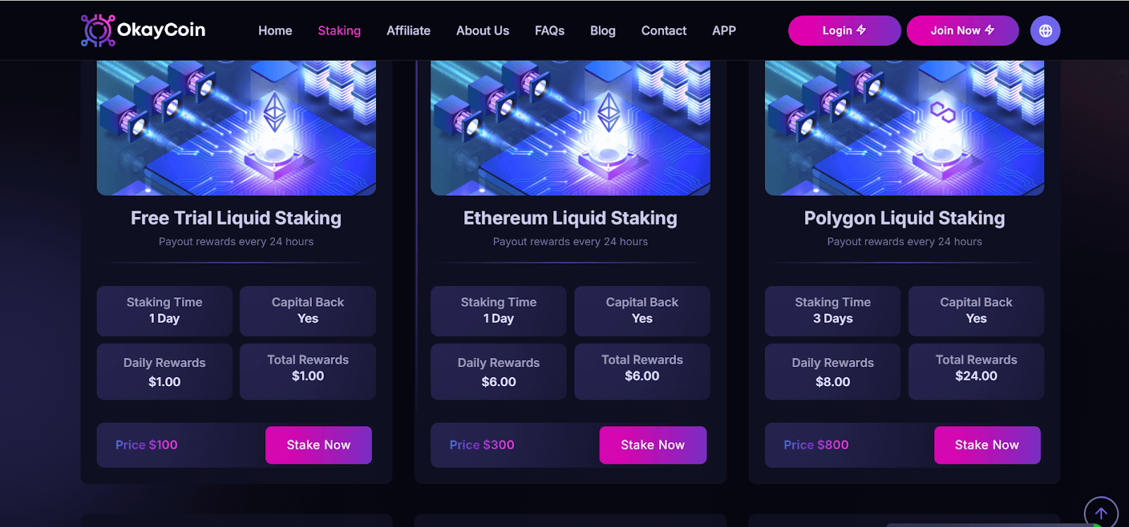OkayCoin has to offer multiple variants of staking for popular cryptocurrencies. All of them come with different rewards for users: