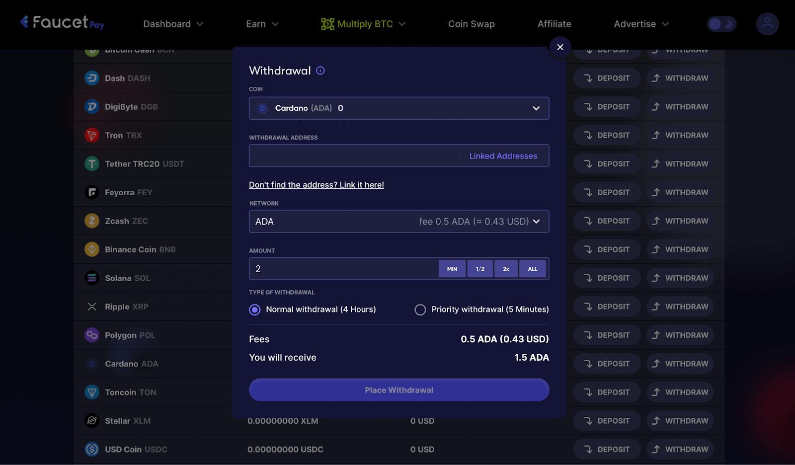 Go to FaucetPay.io and register for a free account. This account includes a built-in crypto micro-wallet that supports multiple assets, including Cardano, Bitcoin, Ethereum, TRON, and more.