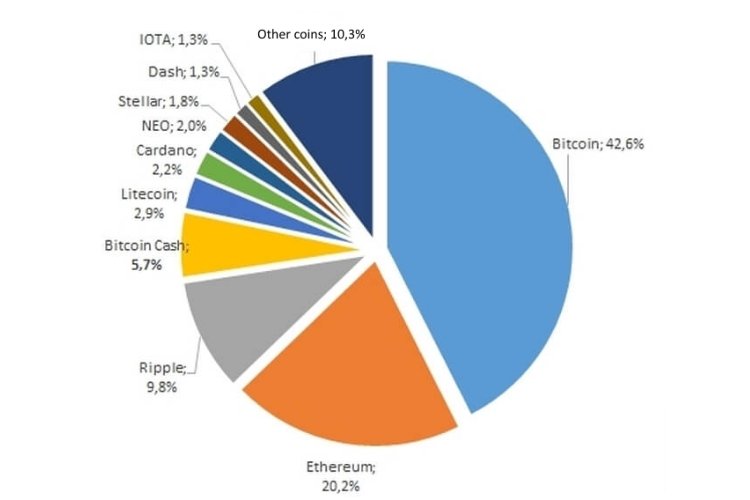 Currently there are over 900 cryptocoins and over 600 tokens on the cryptomarket, their total capitalization is 516,7 billion dollars. The total value of all cryptocurrencies exceeds 460 billion dollars and 90% of this amount is accounted for the following 10 coins: Bitcoin, Ethereum, Ripple, Bitcoin Cash, Litecoin, Cardano, NEO, Stellar, Dash, IOTA.