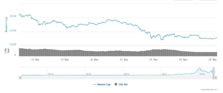 The value of all BTC coins traded on the exchanges decreased by almost 14%, and at the close of trading on May 27, the capitalization of Bitcoin amounted to $125.575 billion. The most unfortunate day for BTC was Sunday as its cost fell to 7270.96 dollars.