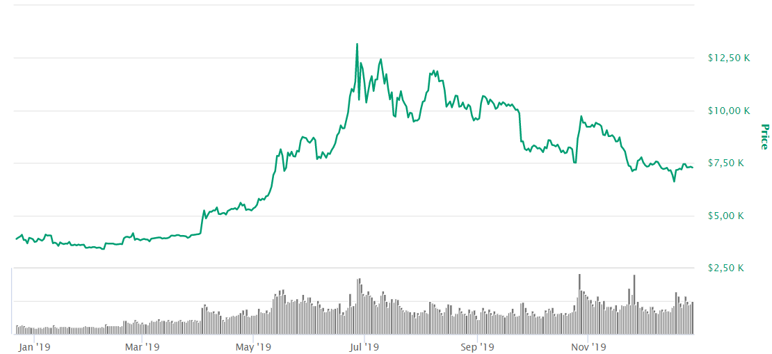 “The trade war between the USA and China allowed Bitcoin to easily overcome the psychological mark of 10 thousand dollars, and the news about the launch of the Libra project led the price to absolute highs above 13 800. The market fell throughout the second half of the year. At first Bakkt did not live up to expectations, then regulators banned Libra, then the US and China suspended the trade war, then they did not let TON launch. Against this background, buyer activity and interest in the crypto declined, and the market moved from highs to bottoms,”