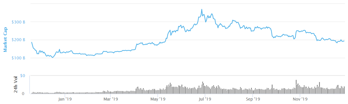 In 2019, the capitalization of the crypto market grew by 54% — from $126 to $194 bln. The beginning of the year was quite calm, no sharp changes in the total value of crypto coins were noted. At the end of March, the market revived and capitalization began to increase rapidly. The most successful time for crypto was in the middle of the year, when the total value of all cryptocurrencies came close to the mark of $370 bln, but after that the trend turned bearish and capitalization decreased.