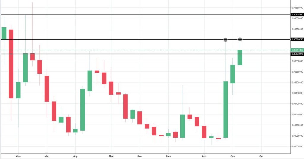 If you take the starting point of the growing trend at the first price impulse confirmed by volume, then the significant level of entry into purchases is located at 0.0055. Additional support for trade at this price will be provided by "magic numbers" - round numbers quotes, which prefers to enter the majority of traders.