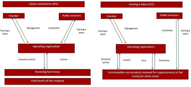 From the legal point of view, the organizational structure of IPO and ICO differs as well. Speaking generally during IPO a person buys shares of a certain company associated with its founders, who also have a stake in it. All of the parties deal at the level of this company. When it comes to ICO, at the moment, unfortunately, the founders often even do not care about registration of the company that is used for fundraising. However, there is a legal pattern that can be applied to ICO. In this regard relations between the participants of ICO and the founders are implemented at the level of the company in foreign jurisdictions that has a positive attitude to cryptocurrency. These relations are fixed by accepting conditions of a public offer published on the project's website that considers tokens as software products which, under certain conditions, may bring profit in the future.