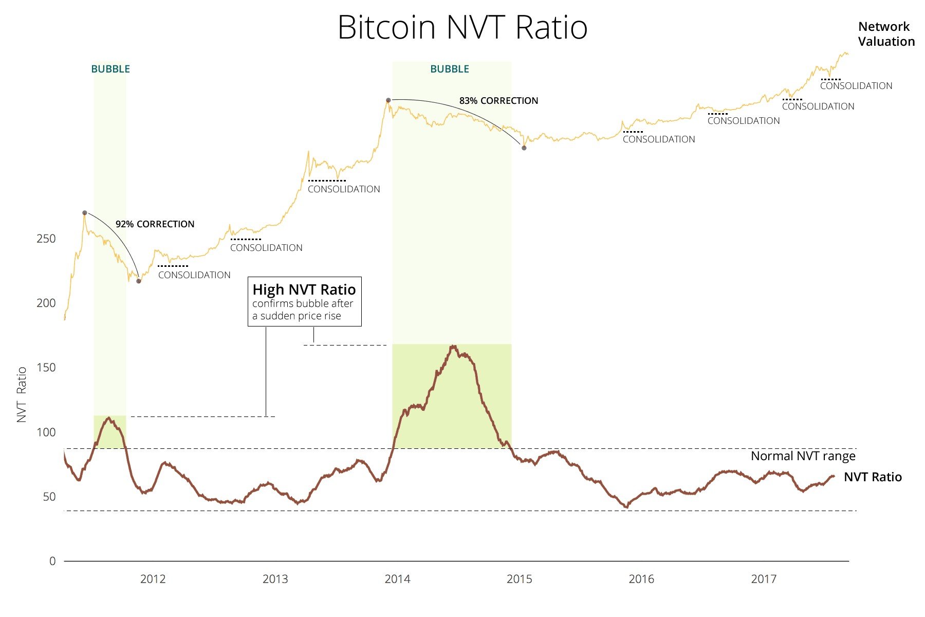 As long as the ratio line is within the normal range, there is no bubble. If the price explosion still occurs, and the NVT line does not cross the upper limit, then we can talk about the normal consolidation, since with the market capitalization growth the daily transaction value increase, and when the price stabilize, it maintains its new increased value and hence there is no significant collapse.