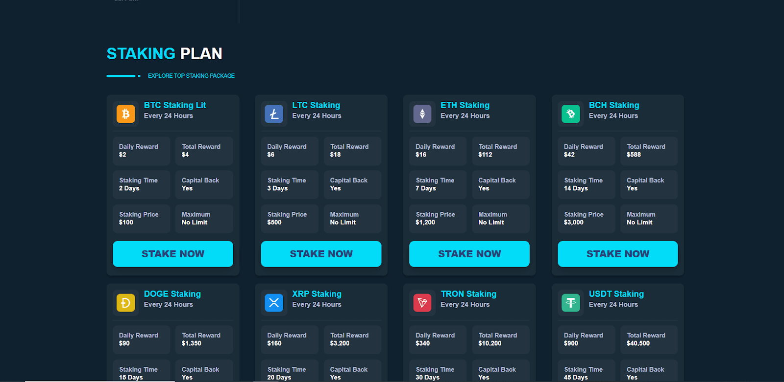 Tether: This is a stablecoin pegged against the U.S. dollar. Staking in USDT provides for non-risky return, hence ideal for investors who seek stability. USDT Plan: $50,000 for 45 days and earn $900 daily.