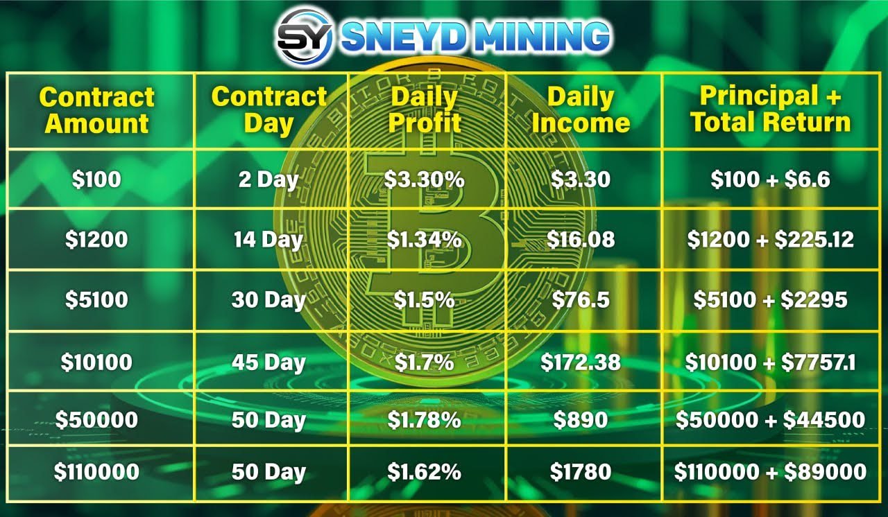 SNEYD MINING employs an innovative cloud mining model that allows investors to enjoy professional cryptocurrency mining services without purchasing expensive hardware or possessing specialized blockchain knowledge. The platform offers various flexible investment options to fully meet the personalized needs of different investors.