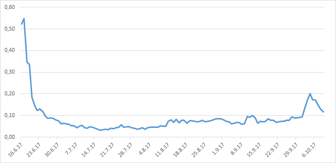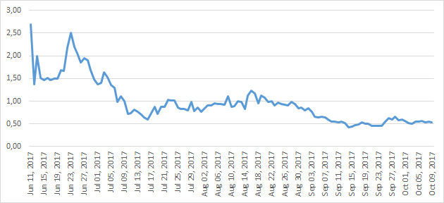 According to Coinmarketcap, the capitalization of SONM tokens is 47.5 million rubles (as of October 9), one coin is worth 0.12 dollars. The cost of the token compared to the date of entering exchanges has decreased almost 3.5 times.