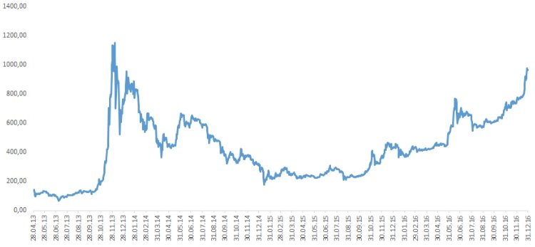 Chart 1. Dynamics of bitcoin price in 2013-2016.