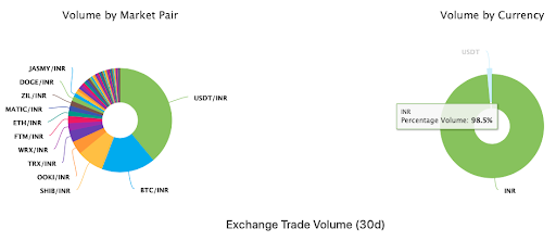 Interestingly, most Indian traders trust more trading through INR only than other available options. Looking at the Exchange Trade Volume Distribution chart of India's biggest exchange WazirX on CoinGecko, we see 96.7% of its buyers prefer INR rather than USDT and home-brewed crypto coin WRX. The buyers prefer depositing cash on exchanges for trading instead of transferring money through P2P. In P2P trading, a buyer receives an equal USDT or Bitcoin in exchange for INR after transfer.