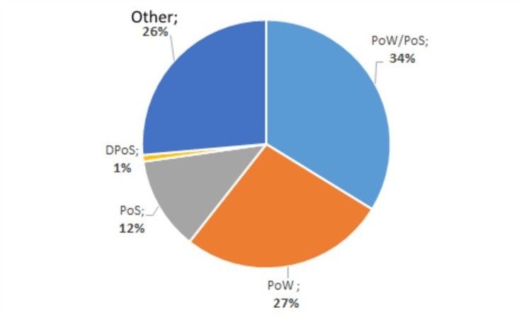 According to cryptocompare.com, 34% of the cryptocurrency projects were hybrid PoW/PoS, 27% - PoW, 12% - PoS, and 1% DPoS.