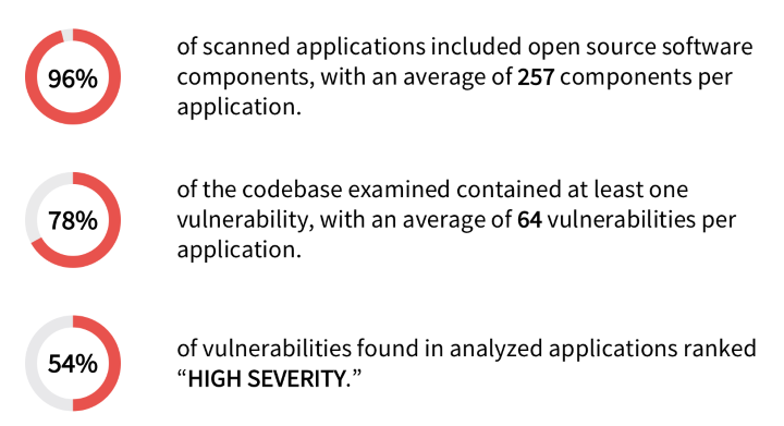 So who’s using all that open source software? According to findings from the same Synopsys study, the answer is – everyone. The audit, which examined more than 1,000 commercial applications, detected open source components in 96 percent of scanned commercial applications. Additionally, the average application contained 257 unique open source components. This growth in OSS adoption is, unfortunately, a double-edged sword. Though a valuable engine of innovation and efficiency, OSS code (like its proprietary counterpart) harbors well-known security vulnerabilities with the potential to debilitate entire IT infrastructures. The Synopsys audit revealed that 78 percent of analyzed applications using open source components contained at least one security vulnerability. Fifty-four percent of the detected vulnerabilities ranked as “High Severity.”