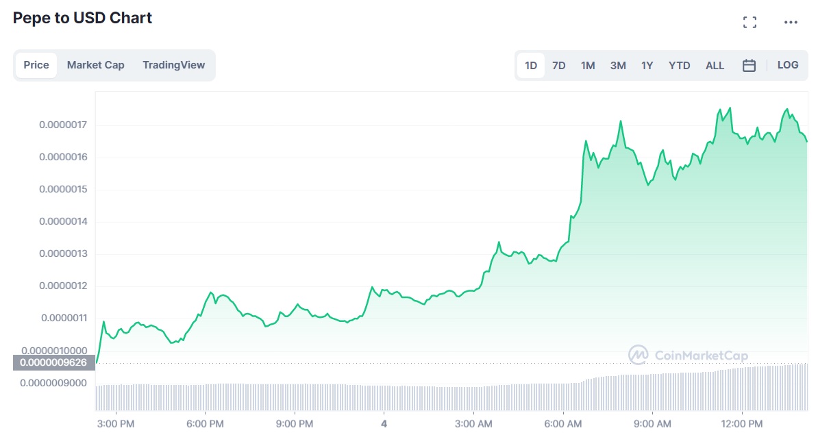 $PEPE, que prácticamente no ha dejado de subir desde su debut el mes pasado, conquistó este jueves una nueva marca histórica de precio de USD $0,000001766. La moneda se ha corregido ligeramente desde los máximos, pero aún mantiene una ganancia de 80% en las últimas 24 horas, con un meteórico repunte de más de 550% durante la última semana.