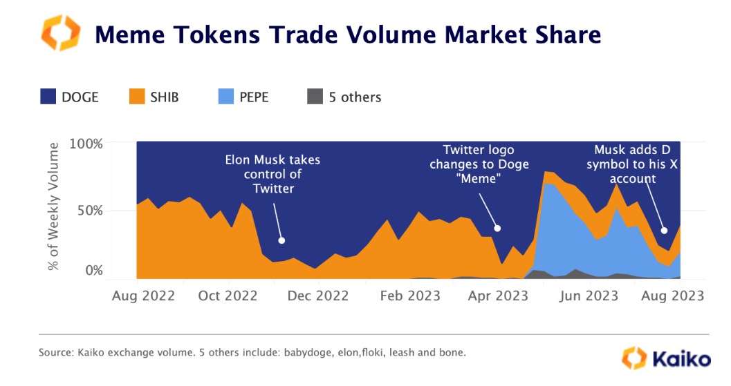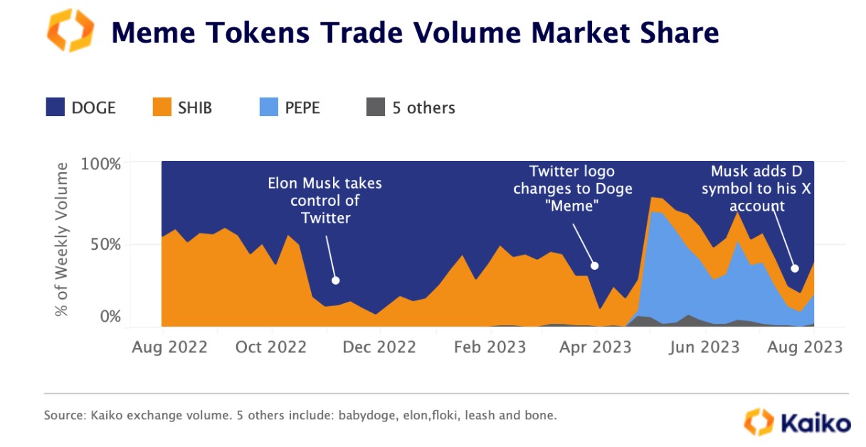 Según registros de Kaiko, el dominio del volumen de comercio de dogecoin ha experimentado tanto subidas como bajadas luego de iniciativas del empresario entusiasta de la memecoin, Elon Musk.