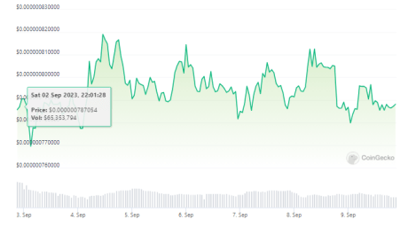 $PEPE, la moneda meme que se ha ganado un culto en el mundo de las criptomonedas, apareció en los titulares una vez más cuando una ballena anónima, que se rumoreaba que se llamaba «Presunto Mattfurie», ejecutó una gran transacción. Según una nueva actualización de precios de $PEPE, esta enigmática figura intercambió la asombrosa cantidad de 726 mil millones de tokens $PEPE por aproximadamente 345,7 Ethereum ($ETH). Es más, el $ETH adquirido llegó rápidamente al intercambio Coinbase, añadiendo intriga a un movimiento ya sensacional. Según los últimos datos de CoinGecko, $PEPE está valorado actualmente en 0,00000078 dólares, con una caída del 2,8% en 24 horas y una pérdida marginal del 0,1% en siete días. Sin embargo, el impacto de este comportamiento de las ballenas está repercutiendo en la dinámica del mercado de la moneda meme. El precio del $PEPE experimentó un breve aumento del 3,48% el 7 de septiembre, pero rápidamente volvió a caer a 0,0000007857 dólares. Esto probablemente indica que un importante poseedor de $PEPE vendió sus 762 mil millones de tokens con pérdidas.