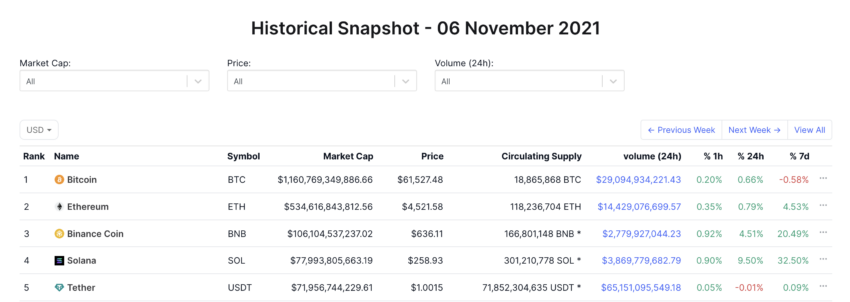 Solana nunca había logrado superar la capitalización de mercado del token BNB de Binance. La instantánea histórica de CoinMarketCap muestra que, cuando Solana estaba alrededor de su máximo histórico en noviembre de 2021, tenía el cuarto lugar basado en la capitalización de mercado.