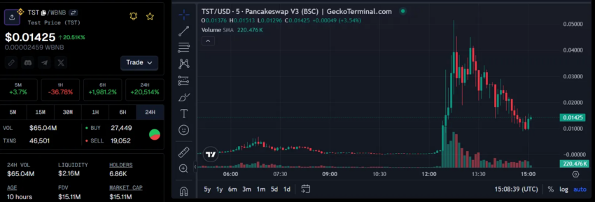 Los datos en Gecko Terminal muestran que TST se mantiene muy por encima de su precio de debut con una capitalización de mercado de 15.1 millones de dólares en el momento de la publicación, pero la acción del precio muestra una continua toma de ganancias.