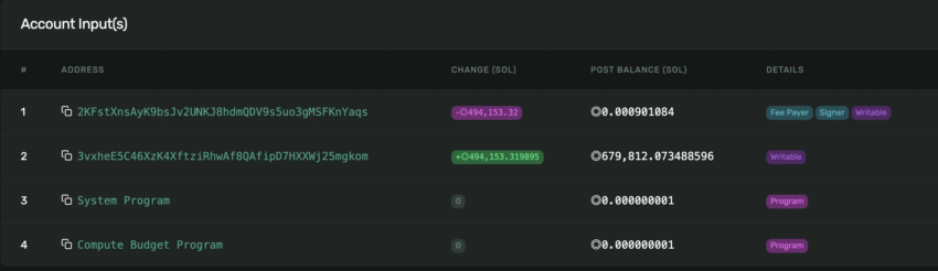 Según Whale Alert, una ballena de Solana (SOL) transfirió 494,153 SOL valorados en 72 millones de dólares a Coinbase Institutional el martes. Entradas significativas en exchanges como esta significan que grandes inversores están moviendo sus holdings de monederos privados a exchanges, a menudo señalando una intención de vender.