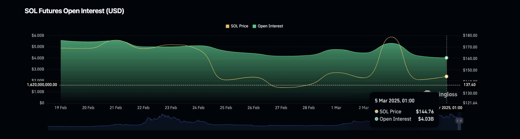 - El interés abierto de SOL ha oscilado alrededor de 4.000 millones de dólares desde el lunes, ya que los operadores especulativos siguen dudando en entrar en nuevas posiciones.