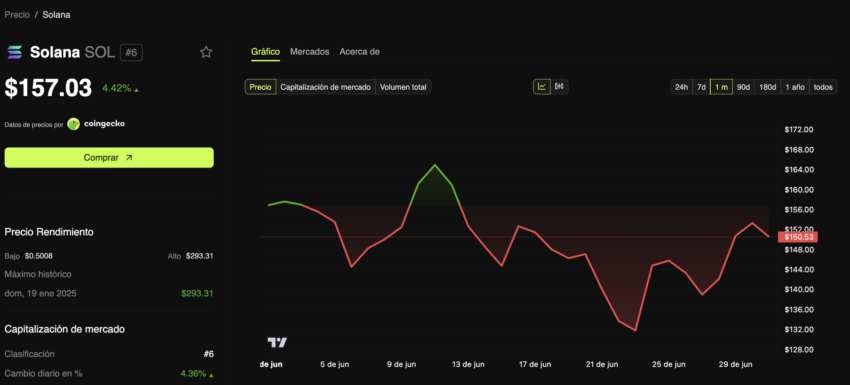La noticia ha generado un optimismo creciente entre los inversores, y esto se ha visto reflejado en el precio de Solana, que pasó de 149 a 159 dólares en pocas horas el 30 de junio, con un aumento del 4,47%. Además, el volumen de trading diario de Solana superó los 4,5 mil millones de dólares, mientras que su capitalización de mercado alcanzó los 85,1 mil millones de dólares.