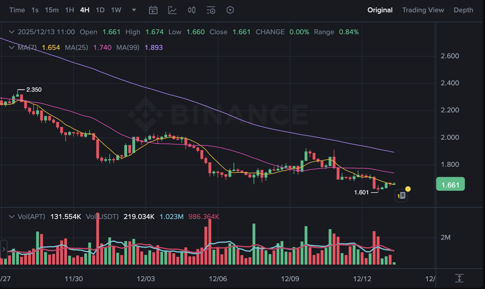 Aptos (APT) ha experimentado una ligera disminución en las últimas 24 horas. Al momento de la publicación del artículo, APT se cotiza a aproximadamente $1.66, mostrando una leve caída en comparación con el cierre anterior. Su punto más alto del día alcanzó cerca de $1.73, mientras que el más bajo fue de aproximadamente $1.61.